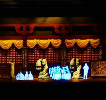 幻影成像系統的主體模型場(chǎng)景,為光學(xué)成像創(chuàng )造環(huán)境空間。造型燈光系統根據場(chǎng)景造型的要求和劇情的需要,在可編程控制器的控制下,配合音樂(lè )、圖像在場(chǎng)景上產(chǎn)生氣氛光,以達到增強展示氣氛,烘托展示效果的目的。光學(xué)成像系統與影視播放系統完成活動(dòng)三維立體視頻在場(chǎng)景造型上的再現,使立體影像與周?chē)娜嗽炀坝^(guān)背景有比較“真實(shí)”的結合。音響系統完成旁白和音樂(lè )的播放?刂葡到y完成多機同步控制、活動(dòng)模型控制、燈光控制、電源控制、播放控制等工作。